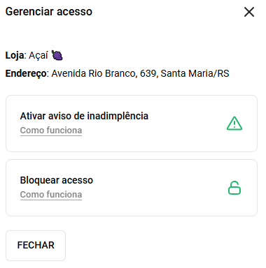 Clicando em acesso, você pode ativar aviso de inadimplência ou até mesmo bloquear o acesso à uma ou mais plataformas. Basta clicar para ativar a opção.