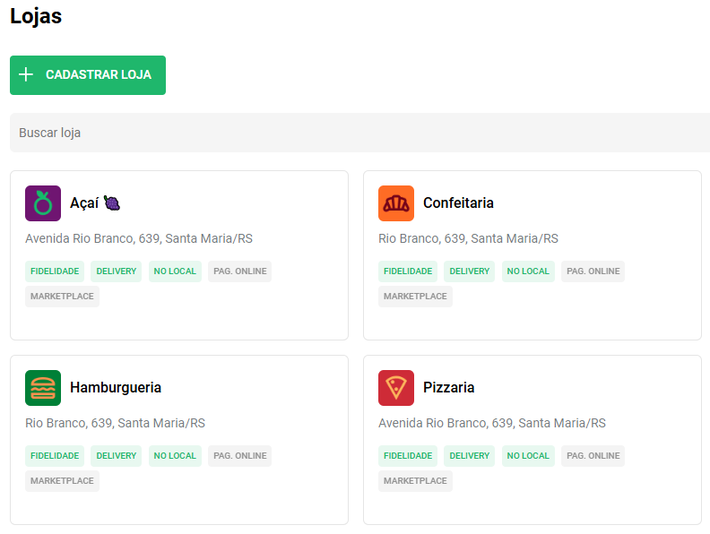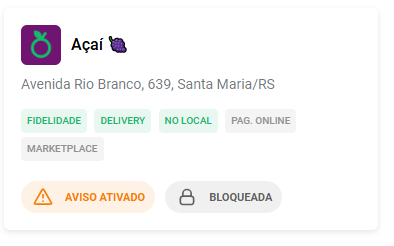 Note que no card da loja você consegue ver se alguma das opções estão ativadas, além do status das plataformas: