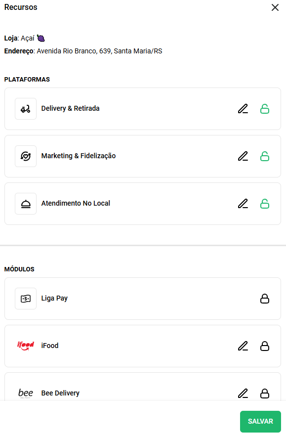 Em Recursos você define quais plataformas e módulos estão ativados ou desativados. Ao clicar no ícone do "cadeado" você ativa ou desativa cada uma delas. Sendo verde ativado e preto, desativado:
