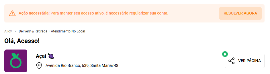 * **Aviso de inadimplência:** Mostra um aviso na página "início" do painel do lojista. Ao clicar em "resolver agora", o cliente é direcionado para o WhatsApp da licença